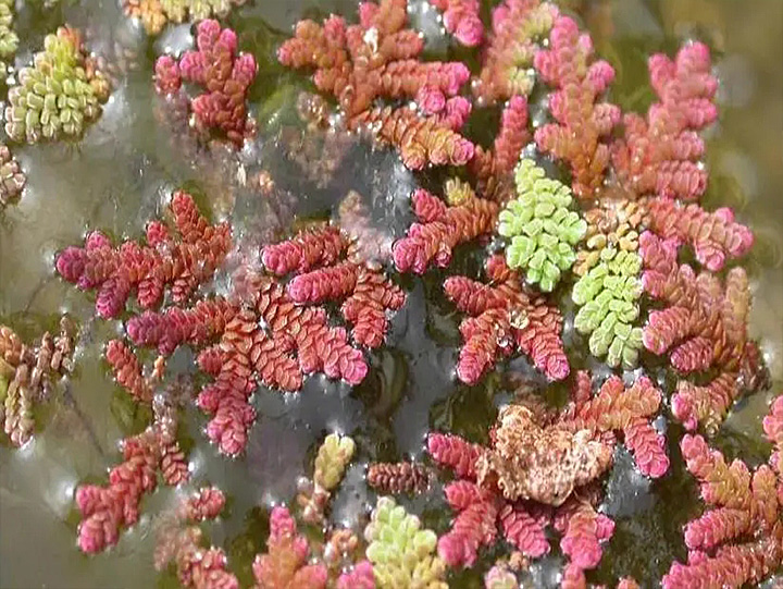 小型漂浮植物。植物体呈卵形或三角状,根状茎细长横走,侧枝腋生,假二歧分枝,向下生须根。叶小如芝麻,互生,无柄,覆瓦状排列成两行,叶片深裂分为背裂片和腹裂片两部分,背裂片长圆形或卵形,肉质,绿色。